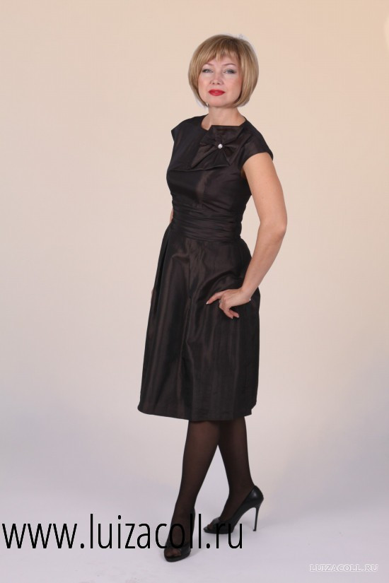 Очаровательное платье средней длины, выполненное из материала приятного шоколадного оттенка. Округлый вырез горловины декорирован изысканными складками и элегантным бантом. Приталенный силуэт и изящная драпировка пояса, выразительно подчеркнут фигуру, а юбка-колокол поможет скрыть возможные недостатки фигуры.
