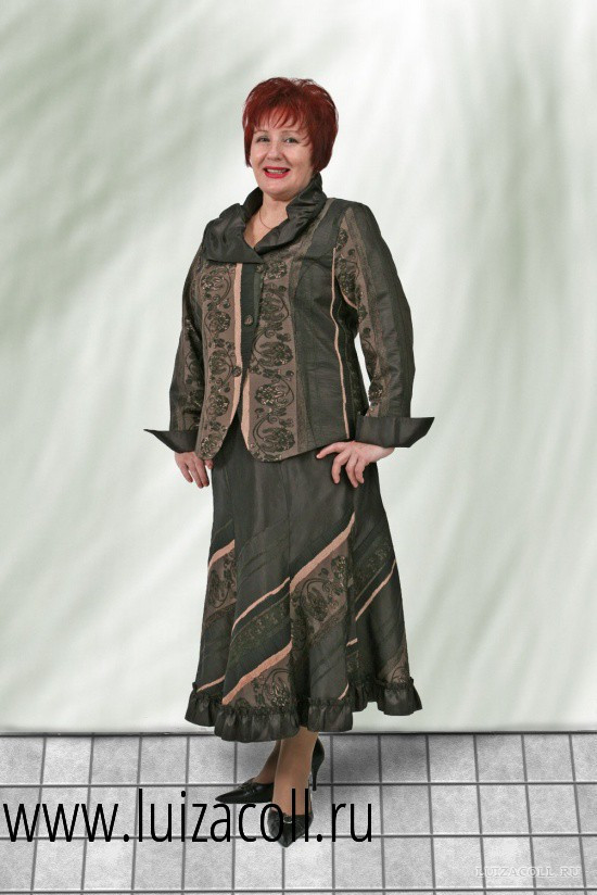 Эффектный костюм, состоящий из юбки и жакета для создания женственного образа. Жакет с длинными рукавами и расположенной по диагонали застежкой на пуговицу. Замечательный шалевый воротник с «жатым» эффектом. Юбка-годе подчеркнет достоинства Вашей фигуры и придаст силуэту изысканности.